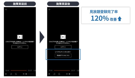 無料動画の再生後、有料の次話に遷移した際に表示されるダイアログに、「見放題プランはこちら」というCTAボタンを追加。加えて、マイクロコピーは「いつでもキャンセルOK!」という解約の簡単さを訴求する内容に。結果、CVR(見放題登録完了率)は約120%改善しました。