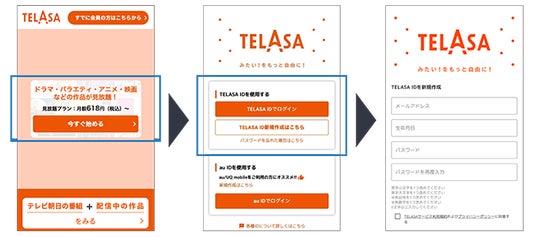 「今すぐ始める」をタップするとTELASA IDもしくはau IDを選択する画面に遷移する。