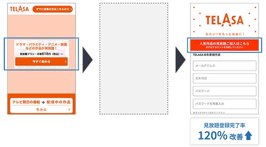LPのCTAボタンの遷移先をログインページからTELASA IDの新規作成画面へ遷移するように変更。新規作成画面ではアカウント作成が必要であることをよりわかりやすくしたところ、CVR(見放題登録完了率)が約120%改善しました。