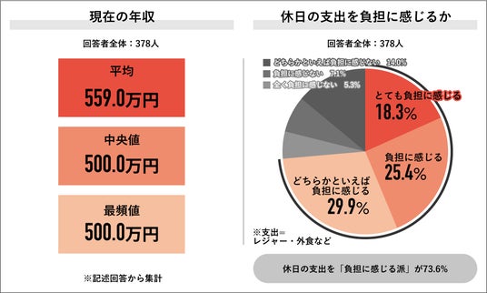 回答者全体の378人に現在の年収を聞くと、平均が559.0万円、中央値が500.0万円、最頻値が500.0万円となりました。また、休日の支出を負担に感じるかを聞くと「負担に感じる派」が73.6%で多数を占め、内訳は「とても負担に感じる」が18.3%、「負担に感じる」が25.4%、「どちらかといえば負担に感じる」が29.9%となりました。