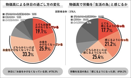 回答者全体の378人に、物価高による休日の過ごし方の変化を聞くと「お金をかけなくなっている派」が78.3%で多数を占め、内訳は「とてもお金をかけなくなっている」が19.1%、「お金をかけなくなっている」が25.9%、「どちらかといえばお金をかけなくなっている」が33.3%となりました。また、物価高で労働を「生活の為」と感じるかと聞くと「感じるようになった派」が64.3%で過半数を占め、内訳は「とても感じるようになった」が17.7%、「感じるようになった」が21.2%、「どちらかといえば感じるようになった」が25.4%となりました。