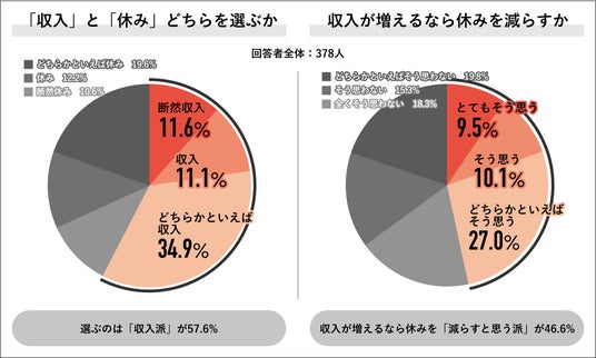 ・全体の57.6%が休みより「収入」を選ぶ 46.6%が収入が増えるなら「休みを減らす」
