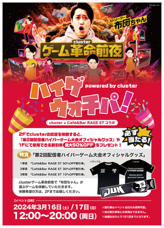 “Cafe&Bar RAGE ST”では「ハイゲウォチパ!」と題して、配信者ハイパーゲーム大会をCafe&Bar RAGE STにて生配信いたします。あわせて、『cluster ゲーム革命前夜』の配信内で布団ちゃんがプレイしたゲームの試遊が可能です。