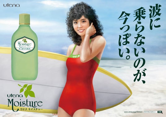 今回の広告では、昭和の時代から変わらぬ姿で親しまれている「ウテナ モイスチャー」を「波に乗らないのが、今っぽい。」というメッセージで表現しました。広告デザインについては、昭和中期のヘアスタイルと水着に身を包んだ阪田マリンさんを油絵タッチで描いた、昭和の絵看板風のデザインにしています。昭和の時代から続くブランドである点を捉え、ブランド誕生よりは少し前の、誰もが昭和感を感じる雰囲気に仕上げました。