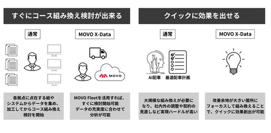 MOVO X-Dataを活用することで、時間、場所、頻度といった要素を基に、膨大な運行実績データから組み合わせ候補を抽出し、拠点間で配送コースを効率的に再構成することが可能になりました。