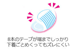 母乳パッドの裏面に8本のテープを端まで付けることで、授乳時に下着ごとめくってもズレにくい仕様。