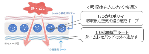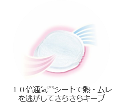 母乳育児は赤ちゃんが直接おっぱいを口に含むので、常に清潔に保てているか心配になります。授乳中のママのおっぱいは、通常時に比べて熱をもち温度が高くなりムレの原因になります。そこで熱・ムレを逃がす10倍通気(※1)シートを採用し、母乳を吸収したあとも空気の通り道をキープすることで通気性を確保でき清潔に保つことができます。(※1:当社製品比)