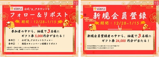 注意事項:キャンペーン期間外に新規会員登録された方は対象外となります。本会員登録までの工程を完了された方が対象です。仮登録までの方は対象外となります。当選者には、キャンペーン終了後1カ月を目途に、Rimple会員情報をもとにメールにて当選のご連絡をいたします。