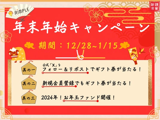「DX」と「不動産」で新たな価値を創造する企業、プロパティエージェント株式会社(本社:東京都新宿区、代表取締役社長:中西 聖)が運営する不動産特定共同事業法に基づく不動産投資型クラウドファンディングサービス「Rimple(リンプル)」(以下、「Rimple」)は、12月28日(木)より「年末年始キャンペーン」をスタートいたします。是非、この機会に奮ってご応募ください。今回も例年、皆さまにご好評頂いている「お年玉ファンド」を年明けに予定しております。