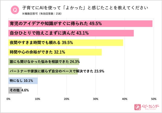 続いて、子育てにAIを使って「よかった」と感じたことを尋ねたところ、最も多かったのは「育児のアイデアや知識がすぐに得られた」(49.5%)、次いで「自分ひとりで抱えこまずに済んだ」(43.1%)、「夜間やすきま時間でも頼れる」(39.5%)などが上位にあがりました。