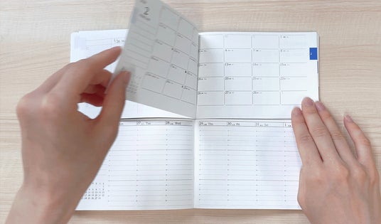 手帳を開くと、ページが真ん中で上下に分割され、上段と下段それぞれを別々にめくれるようになっている独自の構造です。上段の月間予定を見ながら、下段に詳細予定を書くことが可能です。