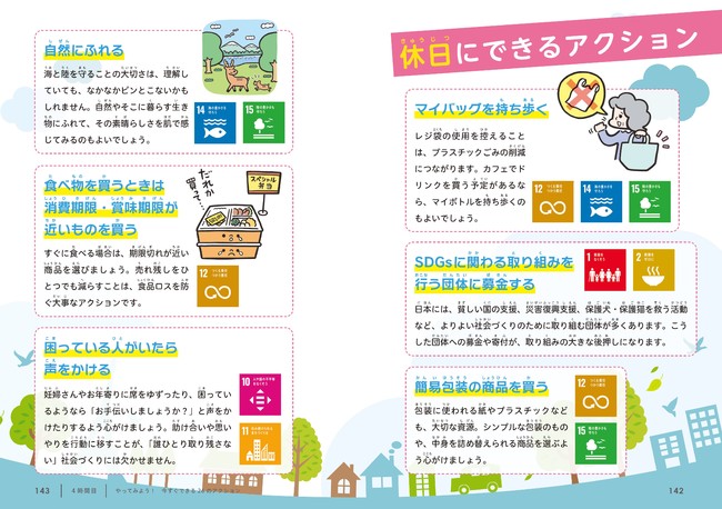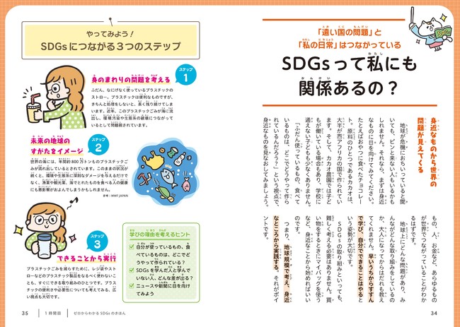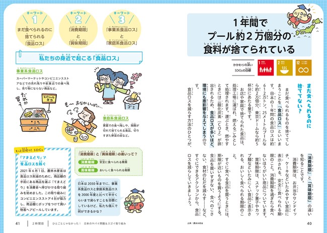 「~を解決するためにはどんな方法があるかな?」「もし◯◯になったらあなたはどうする?」など議論と思考を促すコメントも用意。SDGsを自分ごととして捉えることができます。