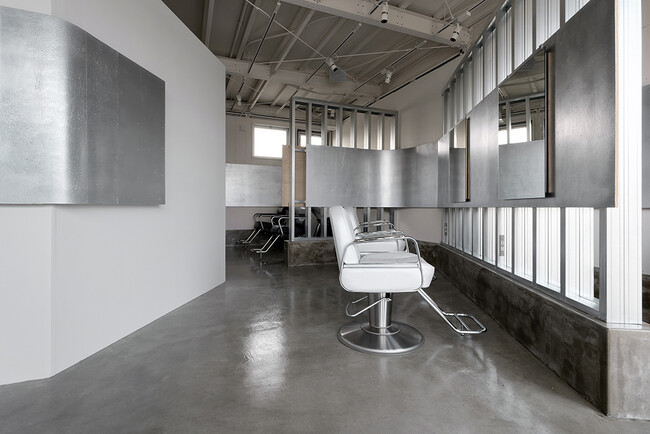 「生まれ変わる」をコンセプトとし、サロンで新たな自分に生まれ変わる顧客の体験と、空間をリンクしていくようにデザイン。古いテナントビルの既存の特性を活かしつつ、新たな特性を加えることで空間を作り上げている。ラワンの曲げ合板を壁に沿わせ、木目を残しつつ銀色に塗装。可動式ミラーを掛けるなどの機能もあり、サロンのアイコンとなっている。空間全体を銀色の帯でつなぐことで空間を統一し、インパクトのあるデザインに仕上げた。