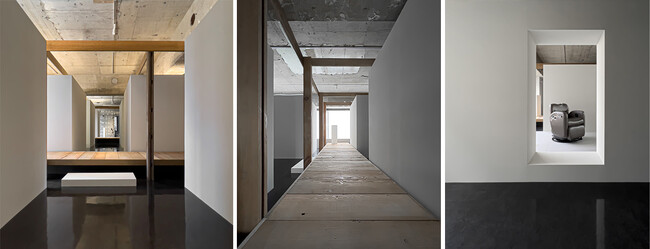 それらの要望をまとめ、4つの部屋を十字型の通路空間でつなぎ合わせる「田の字」レイアウトを採用。個室のプライバシーを高めることはもちろん、移動する際の期待感やリセットする時間など通路空間での体験に着目して空間を構成しました。黒い水盤を思わせる空間から、桟橋を思わせるウッドデッキの空間に進むと、先にはルーフバルコニーからのふんだんな自然光が待ち受け、そこから脇に降り個室へと進む導線をデザイン。進むに連れてシーンの変化が現れ、記憶に残る空間となっています。また、デッキや柱には木造住宅の解体時に取り外した古材を使用。加工や経年変化の跡、色ムラ等はそのまま使用し、外にいるような印象を空間に添えています。