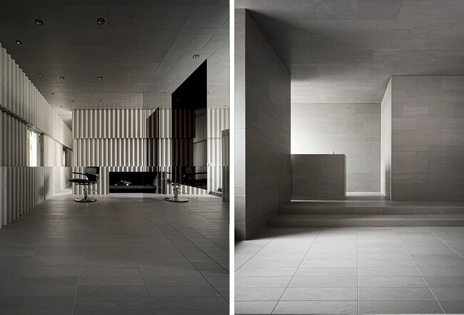 ご夫婦による郊外の独立開業案件。「白色や木目を使用せず、グレーのみの洗練された凛とした空間デザイン」が求められた。お客様やここで行われるサービスを主役と考え、それを引き立たせるために空間はグレーにしたいという意図である。店名の「Hui」はハワイ語で「集まる」の意。そこから着想し、グレー一色の空間に波で陰影をつけたグラデーションを添えた。波をズラして設置することで、陰影と併せて立体感や重厚感、オリジナリティを演出。またズレにより生まれる奥行きを活かしてディスプレイができる棚機能に充てた。 さらに、波とは対比的に石素材のみで構成するプレーンなカウンターを置くことで、空間全体に落ち着きを加えている。