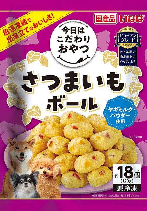 いなばペットフード株式会社(いなば食品グループ 本社:静岡県静岡市清水区由比)は、わんちゃん用冷凍ペットフード「今日はこだわりおやつ さつまいもボール」を新発売しました。
