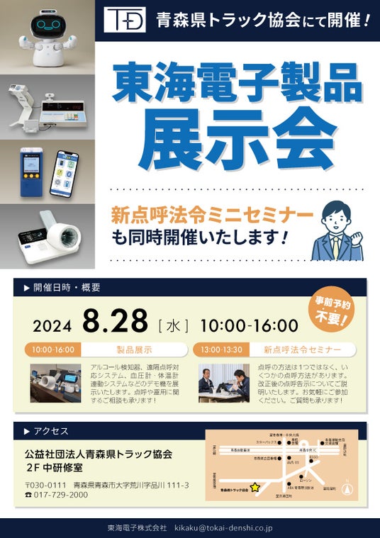 アルコール検知システム、 IT点呼システム、 運行管理システムを開発・販売する東海電子株式会社(本社:静岡県富士市 代表取締役 杉本 哲也)は、 8月28日(水)に青森県トラック協会にて、アルコール検知器、遠隔点呼対応システム、血圧計・体温計連動システムなどの製品を一堂に集めた展示会を無料開催いたします。また、改正後の点呼告示についてご説明する「新点呼法令セミナー」も同時開催いたします。事前予約は不要です。お気軽にお立ち寄りください。