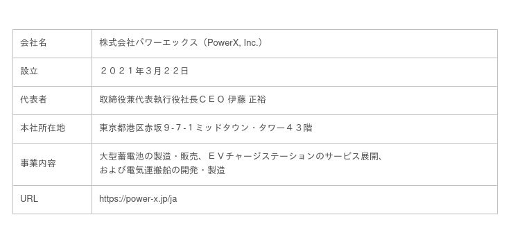 パワーエックスは、蓄電池に関する独自の設計製造技術および制御技術を有し、系統用および家庭用定置式蓄電池、船舶用蓄電池、蓄電池を活用した高性能なEV急速充電器の開発と販売、EV普及に不可欠な充電ステーション(以下「PowerXチャージステーション」)事業、更には遠隔地との海上送電を可能とする電気運搬船事業の展開を計画するなど、日本のカーボンニュートラル実現に大きく貢献する可能性を持つ企業です。