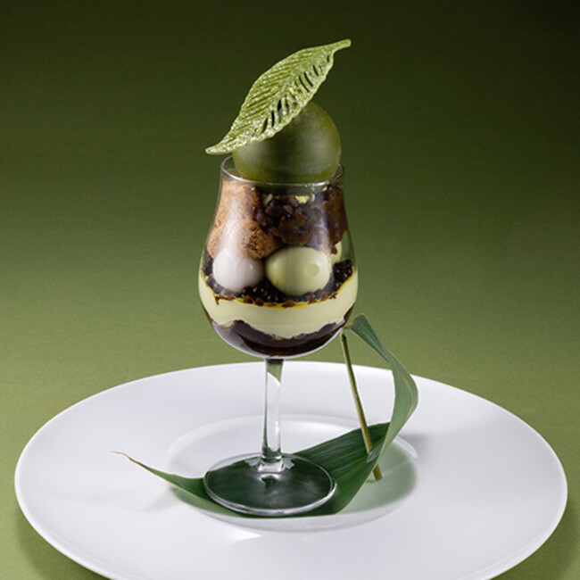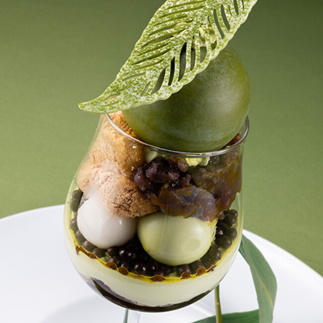 和三盆を使用して優しい甘さに仕上げた濃厚抹茶アイスに、3日間かけて炊き上げる自家製粒餡や朝炊きのわらび餅など、こだわりの和スイーツを合わせます。モンブランクリームや黒蜜の甘さをアクセントに、抹茶の風味を感じる大人な味わいに仕上げました。