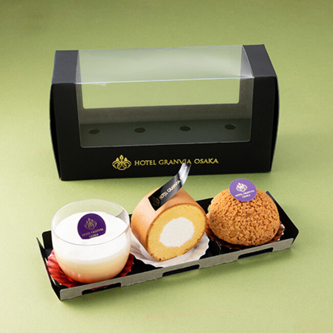 パティシエこだわりのスイーツ「なめらかプリン」「和三盆ロールケーキ」「梅田シュー」を詰め合わせた、テイクアウト限定商品。