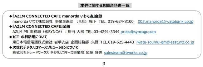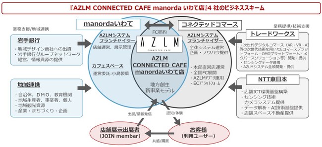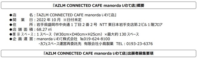 manorda いわて株式会社(本社:岩手県盛岡市、代表取締役:菊地文彦、岩手銀行が 100%出資する銀行業高度化等会社)、東日本電信電話株式会社岩手支店(所在地:岩手県盛岡市、支店長:片岡千夏 以下、NTT 東日本)、『AZLM CONNECTED CAFE(エイゼットエルエム・コネクテッド・カフェ)渋谷地下街店』を企画・運営するコネクテッドコマース株式会社(本社:渋谷区渋谷、代表取締役:中村武治 以下、コネクテッドコマース社)、AZLM の EC システム・専用アプリ開発・システム全般を担う株式会社トレードワークス(本社:千代田区神田、代表取締役社長:浅見勝弘)の 4 社は、2022 年 10 月、NTT 東日本岩手支店第2ビル 1F(盛岡市中央通)に、最新テクノロジーによるライブマーケティング CAFE『AZLM CONNECTED CAFE manorda いわて店』をオープンします。