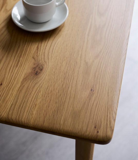 商品開発においては、新築戸建ての住宅に合う上質さを、手の届く価格帯で実現することに注力しました。木目が美しく贅沢なオーク材を使用すると共に、デザイン面でも圧迫感の少ないサイズ感とデザインを意識しました。特にテーブルやチェアにおいてはデザインの肝となる脚の形状に特にこだわり、試作品の模型であるモックを何度も削って微調整を重ねて完成。見る角度によって表情が変わるのが絶妙なラインに仕上げました。また角がないデザインでお子さまがいる家庭でも安心して使えます。