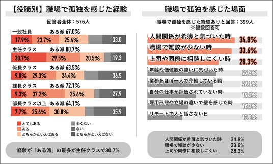 職場で孤独を感じた経験が「ある派」の役職別では主任クラスが80.7%で最多となり、次いで課長クラスが72.1%、一般社員クラスが67.0%、部長クラス以上が64.1%、係長クラスが63.5%となりました。職場で孤独を感じた経験ありと回答した399人に、職場で孤独を感じた場面を聞くと「人間関係が希薄だと気づいた時」が34.8%で最多となり、次いで「職場で雑談が少ない時」が33.6%、「上司や同僚に相談しにくい時」が28.3%となりました。