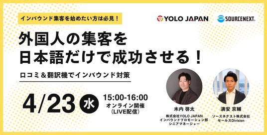 日本に住む外国人30万人以上が登録する日本最大級の外国人求人情報サイト「ヨロワーク」を運営する株式会社YOLO JAPAN(代表取締役:加地太祐、大阪本社:大阪市浪速区、以下「YOLO JAPAN」)とAI通訳機「POCKETALK(ポケトーク)」を開発するソースネクスト株式会社は、インバウンド対策をテーマにした「外国人の集客を日本語だけで成功させる!」無料セミナーを共同開催いたします。