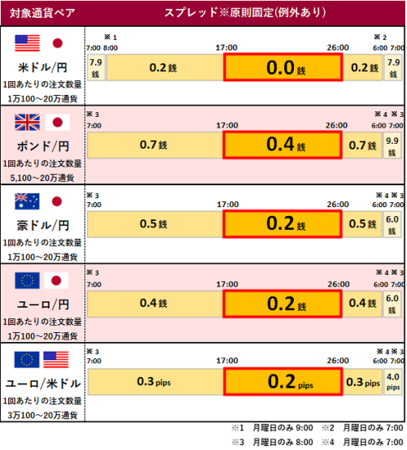 ※主要経済指標発表時等の急変時、国内外の休日や平日早朝など著しい流動性低下時はやむをえずスプレッドを拡大する場合がございます。 メンテナンス時間(火曜日~金曜日 各日5:55~6:10、土曜日5:50~月曜日7:00)は適用時間に含まれません。