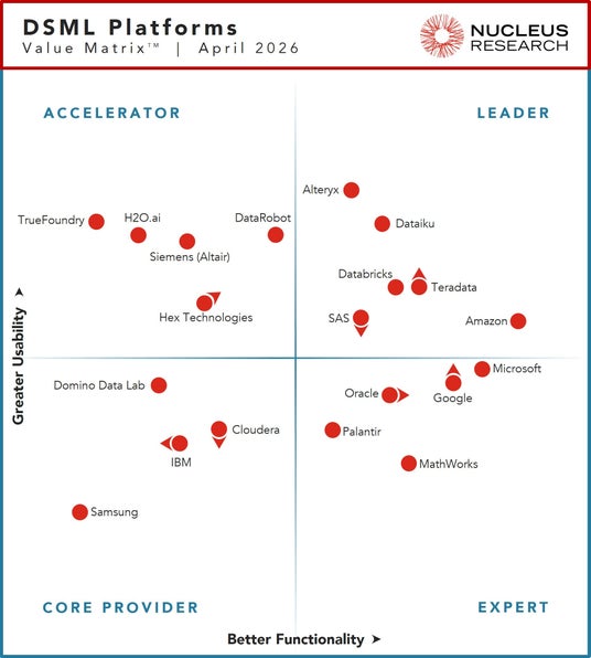 Teradata(NYSE: TDC)は本日、Nucleus Research社が2026年4月7日に発表した「2026 Data Science and Machine Learning (DSML) Platform Technology Value Matrix」において、「リーダー」に選出されたことを発表しました。本調査は、DSMLプラットフォームを「機能性(Functionality)」と「使いやすさ(Usability)」の2軸で評価する年次のバリュー・マトリックスです。リーダー・クアドラントは、エンタープライズ顧客に対して最高レベルの価値を総合的に提供しているベンダーに与えられます。今年は20社以上のベンダーが評価対象となりましたが、リーダーの称号を得たのは、その中でも厳選された数社のみでした。