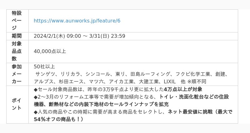 建材スーパーセール:https://www.aunworks.jp/feature/6