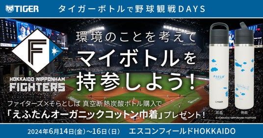 熱制御テクノロジーで世界をリードするタイガー魔法瓶株式会社(社長:菊池嘉聡、本社:大阪府門真市)は、北海道日本ハムファイターズとコラボレーションし、マイボトルを持参してスポーツ観戦を楽しむスタイルを推奨する「タイガーボトルで野球観戦DAYS~環境のことを考えてマイボトルを持参しよう~」を 6月14日(金)~16日(日)にエスコンフィールドHOKKAIDOで行われる3連戦にて、開催いたします。