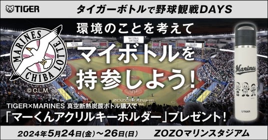 千葉ロッテマリーンズとコラボレーションし、マイボトルを持参してスポーツ観戦を楽しむスタイルを推奨する「タイガーボトルで野球観戦DAYS~環境のことを考えてマイボトルを持参しよう~」を 5月24日(金)~26日(日)にZOZOマリンスタジアムで行われる3連戦にて、開催いたします。