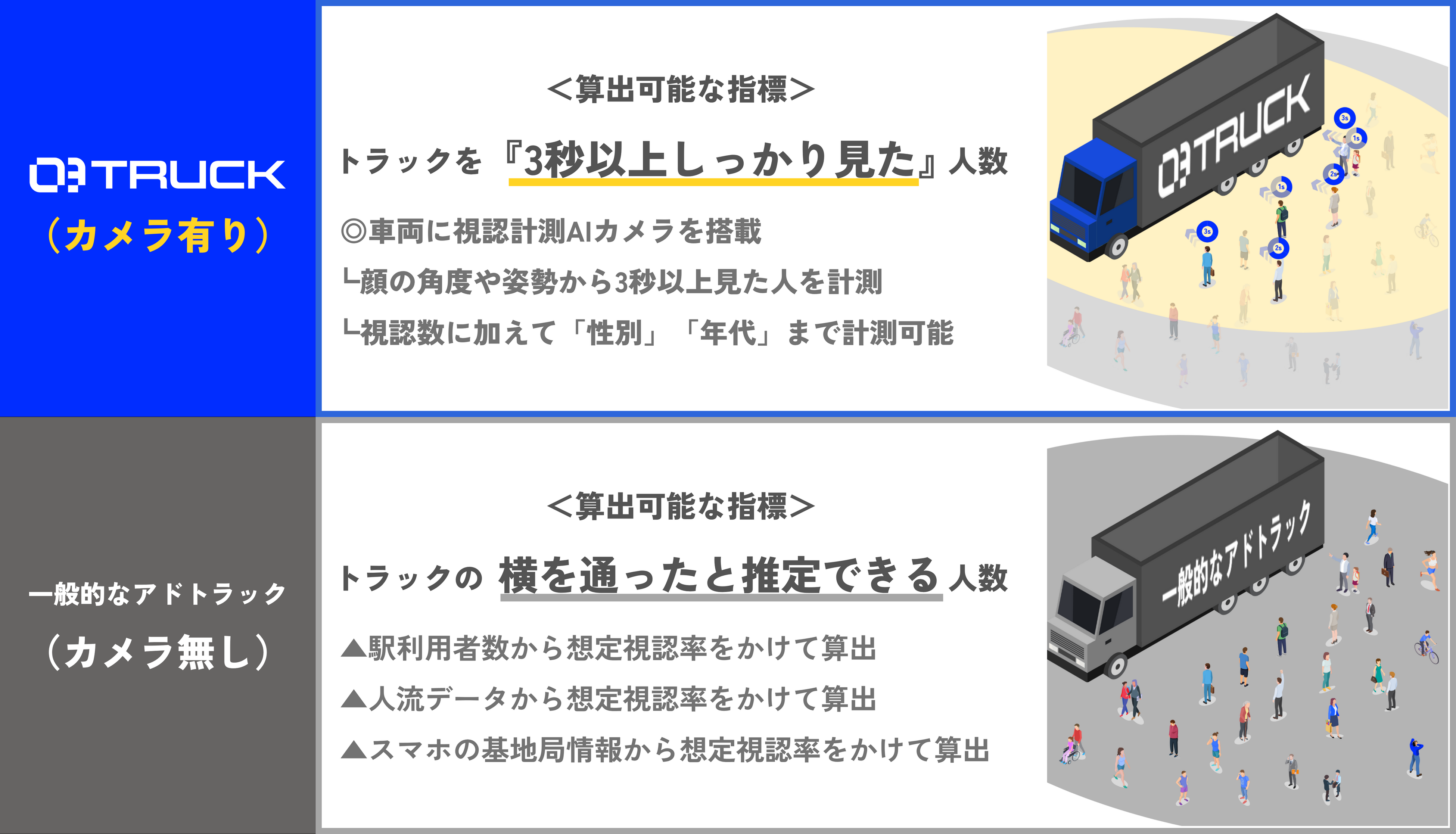 従来のOOH広告が人流データなどから広告接触ユーザー数を「推定」していたのに対し、「O3 TRUCK」は独自の技術を搭載したAIカメラを用いて「広告を3秒以上しっかりと見た人」をカウントします。これにより、広告主は、走行中のアドトラックに本当に興味を示した人数を正確に把握できるようになります。なお、撮影した動画データは個人を特定しない形でオーディエンス属性の推定や接触数、視認数などの集計後、即時に削除されます。