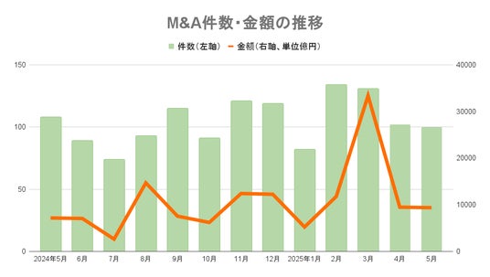 2025年5月のM&A件数(適時開示ベース)は前年同月比8件減の100件となり、4カ月ぶりに前年比で減少しました。一方、取引総額は9372億円と前年同月比で9.9%増加しています。上場企業の適時開示情報のうち、経営権の移転を伴うM&A(グループ内再編は除く)について、M&A Online編集部が集計しました。