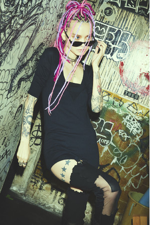 涼しげなホールから覗く凛とした肌と黒のコントラストが印象的なセットアップ。フェミニンな表情とパンク・ロックな雰囲気を併せ持つルックは2003春夏コレクションからのセレクト。オパール加工によって生地にホールに作り、更に洗いをかけてホール周辺に生まれるほつれをアクセントとして仕上げています。