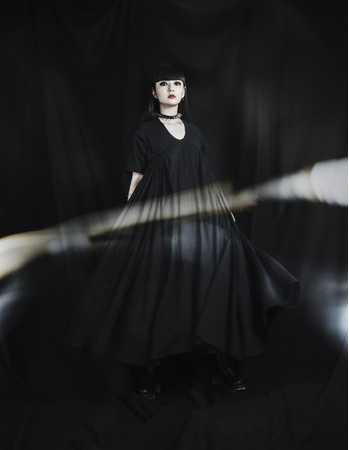 黒でありながら軽やかなワンピースルックは2010春夏コレクションからのセレクト。3重織りのガーゼに洗い加工を施すことでナチュラルな風合いを持たせています。胸元から延びる細やかなフレアは、裾に向かって柔らかく大きな円を描き出します。