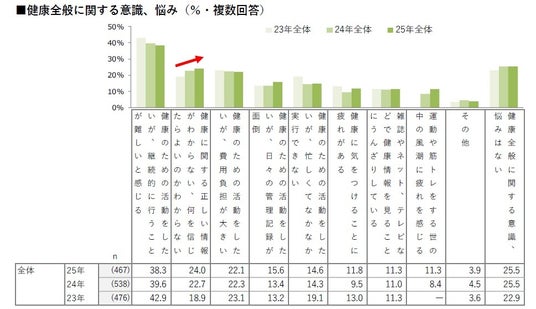 健康全般に関する意識、悩みは、「健康に関する正しい情報がわからない、何を信じたらよいのかわからない」が2023年から増加傾向