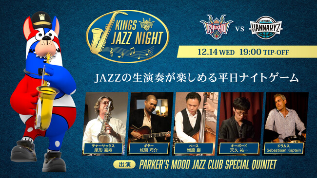 12月14日(水)の京都戦は「KINGS JAZZ NIGHT」!当日は特別なJAZZゴーディーも登場!試合前からジャズの生演奏が楽しめる、お洒落で大人な雰囲気の平日ナイトゲームをお楽しみください。