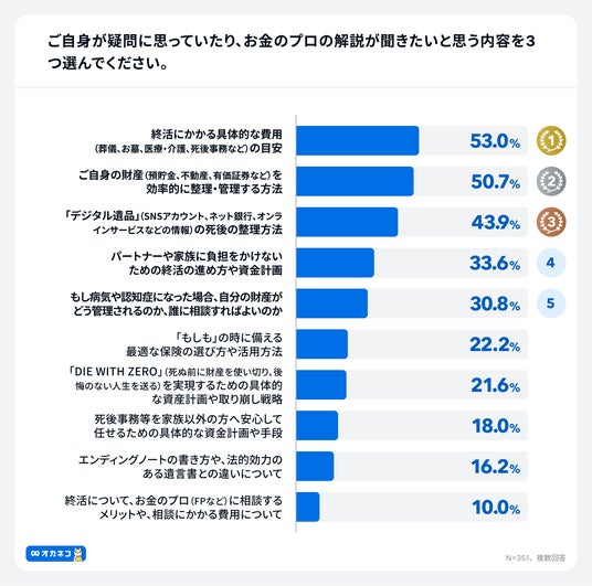 一方で、終活は、多岐にわたるお金の知識や法的な手続きが伴うため、その複雑さに戸惑う方も少なくありません。そこで本調査ではさらに、ユーザーが実際に疑問に思っている内容を深掘りするべく、当社に多く寄せられる終活に関するお金の相談内容から「お金のギモン」を選んでもらいランキング化しました。