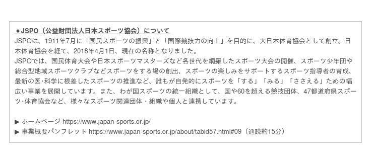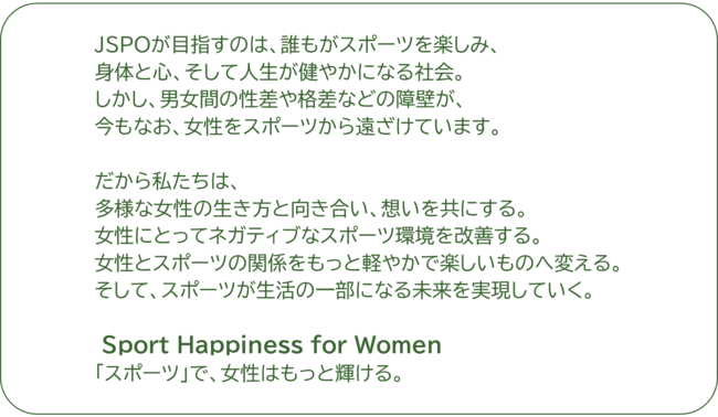 JSPOは、女性のスポーツに関する活動環境の充実や改善を通じて、女性のスポーツ参加(参画)を促し、より公平なスポーツ文化を確立すること、言わば「もっと、女性が、スポーツを楽しむ社会」の実現を目指し、平成29(2017)年に女性スポーツ委員会を設置しました。