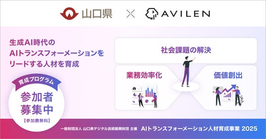 株式会社AVILEN(本社:東京都中央区、代表取締役:高橋 光太郎、以下「AVILEN」)は、2024年に引き続き、一般財団法人 山口県デジタル技術振興財団(所在地:山口県山口市、理事長:原田 英明、以下「山口県デジタル技術振興財団」)が進める「AIトランスフォーメーション人材育成事業」を昨年に続き、2年連続で支援することを決定いたしました。