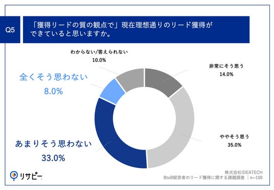 「Q5.「獲得リードの質」の観点で、現在理想通りのリード獲得ができていると思いますか。」(n=100)と質問したところ、「あまりそう思わない」が33.0%、「全くそう思わない」が8.0%という回答となりました。