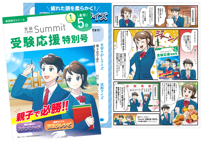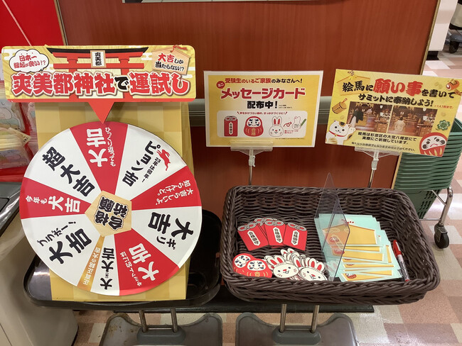 受験生を楽しく応援する企画として、1月11月号のチラシは縁起の良さに徹底的にこだわりました。店頭で配布している「予備校の講座テキスト風リーフレット」や、一部店舗に設置している「合格祈願サミット神社」で「ほぼ大吉しか出ないおみくじルーレット」等もお楽しみいただけます。