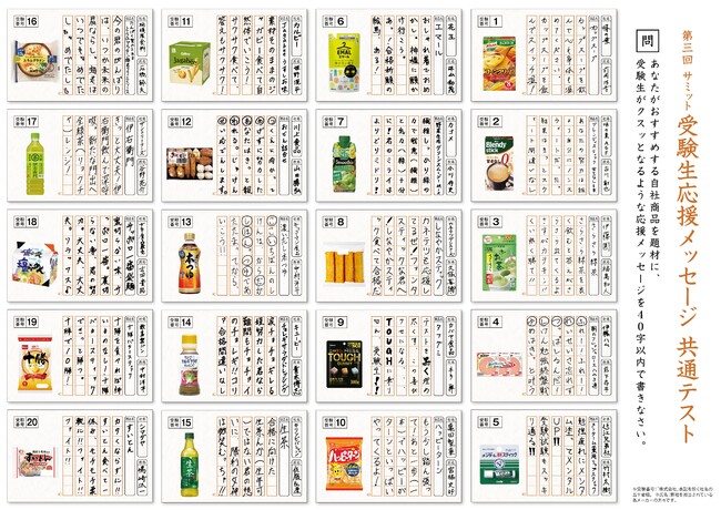 「問: あなたがおすすめする自社商品を題材に、受験生がクスっとなるような応援メッセージを40字以内で書きなさい。」