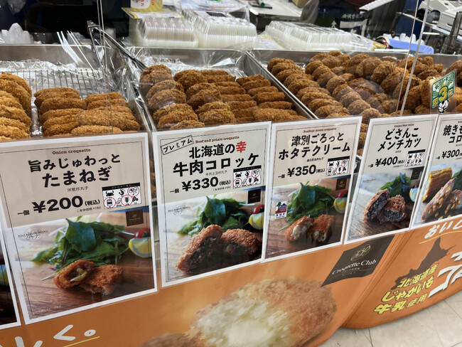 店内厨房で揚げたコロッケが10種以上並びます。今展では初登場の、北海道産生乳を使用しベビーホタテが丸ごと入った旨味たっぷりの「津別ごろっとホタテクリーム(350円)」、タマネギを香ばしくシャキトロ食感に仕上げた「旨みじゅわっと たまねぎ(200円)」の2種もそろいます。