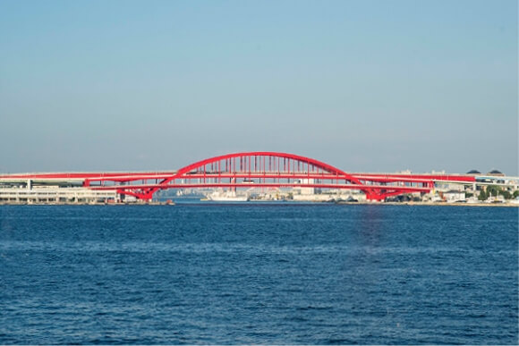 ポートターミナルとポートアイランド間に架かる、日本初のダブルデッキタイプのアーチ型の橋。全長319メートルの神戸大橋は、神戸港のシンボル。