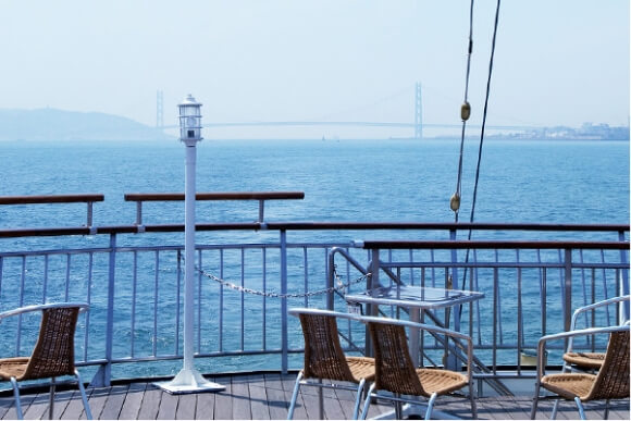 山、街、海をもつ街、神戸。その全てを船上から一望できます。2002年ワールドカップの会場として誕生した国際級競技専用スタジアム、ノエビアスタジアム(旧ウイングスタジアム)の翼をイメージしてデザインされた開閉式ドームが、遠くに見える六甲山の山並みや海の風景と印象的に調和して見えます。