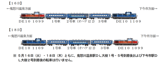 今回のプッシュプル運転では、国鉄時代のディーゼル機関車の基本カラーである鮮やかな朱色の塗装が施されたDE10 1099号機と青色の車体に金色の帯と流星マークを施したDE10 1109号機を使用するほか、 プッシュプル運転を行う両日それぞれで、DLの連結方法を変更して運行いたします。