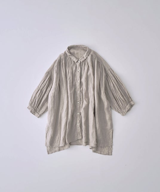 ギャザーをたっぷりと入れ、ふんわりとしたサイジングで肌離れが良く暑い日にも快適に過ごせる着心地の良いアイテムです。
